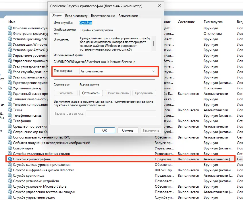– Убедитесь, что Службы криптографии работает и настроена на Автоматический запуск.
