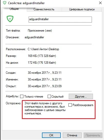 2. Файл, загруженный из интернета, помечен как заблокированный.
