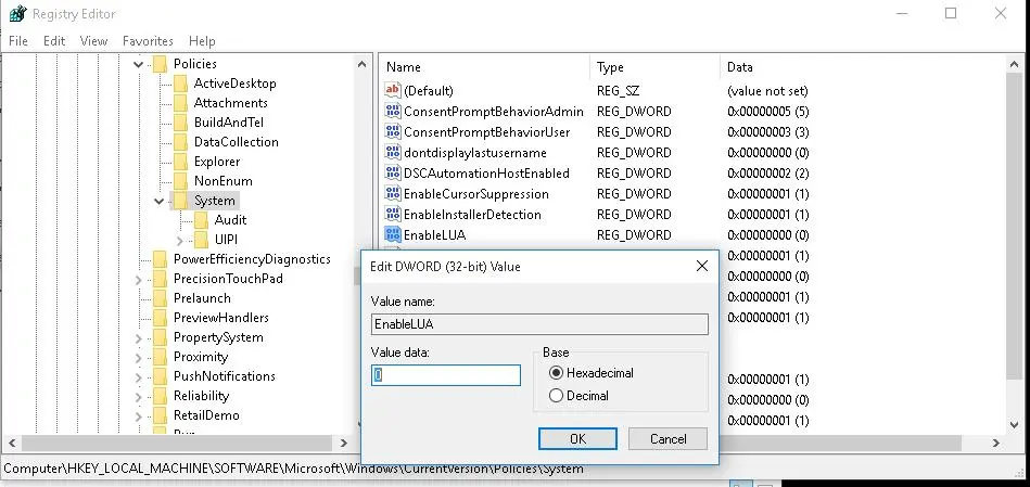 reg add HKLM\SOFTWARE\Microsoft\Windows\CurrentVersion\Policies\System /v EnableLUA /t REG_DWORD /d 0 /f