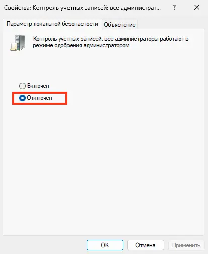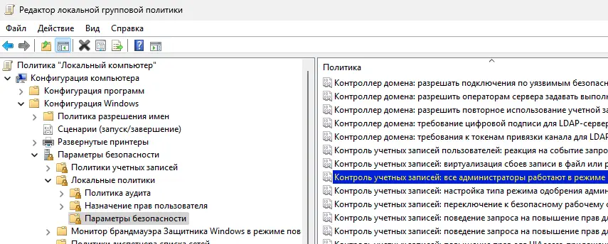 3. Найдите политику Контроль учетных записей: все администраторы работают в режиме одобрения администратором.