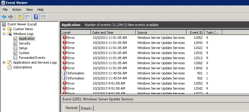 В журнале событий можно обнаружить сообщения об ошибках, таких как “Service wuauserv has unexpectedly stopped” и “The Windows Update service terminated unexpectedly”.