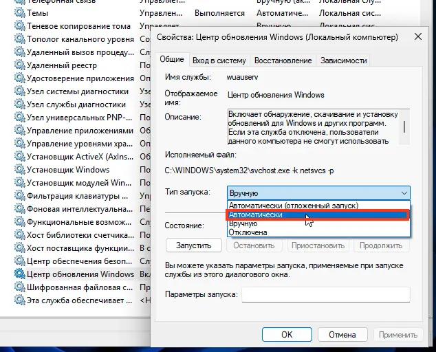3. Убедитесь, что тип запуска — Автоматически, и службы запущены. Если служба остановлена — запустите её.