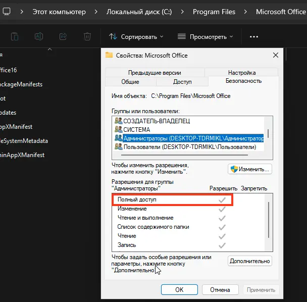 3. Убедитесь, что у вашей учётной записи и группы Администраторы есть полный доступ (Full Control). При необходимости добавьте разрешения.