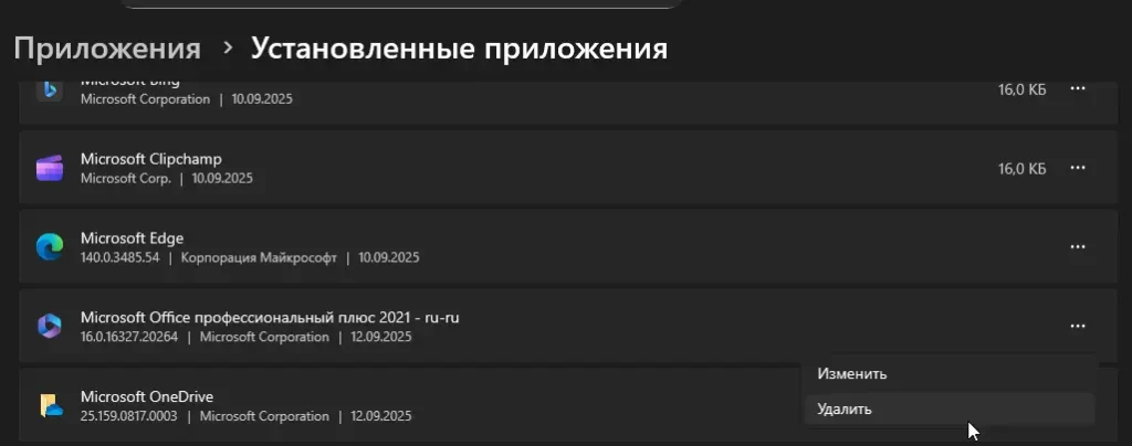– Удалите Office через Панель управления → Программы и компоненты или Параметры → Приложения.