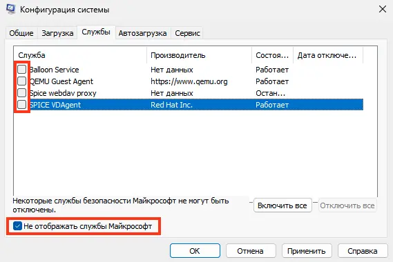 2. На вкладке «Службы» отметьте «Не отображать службы Microsoft» и отключите всё лишнее.