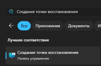 1. В меню «Пуск» найдите «Создание точки восстановления».