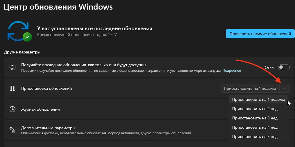 2. Нажмите Приостановить обновления на 7 дней (можно несколько раз подряд).