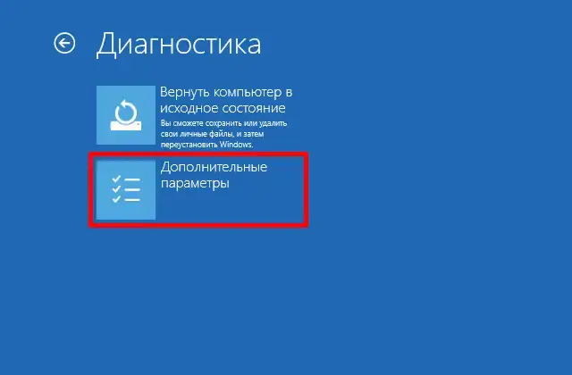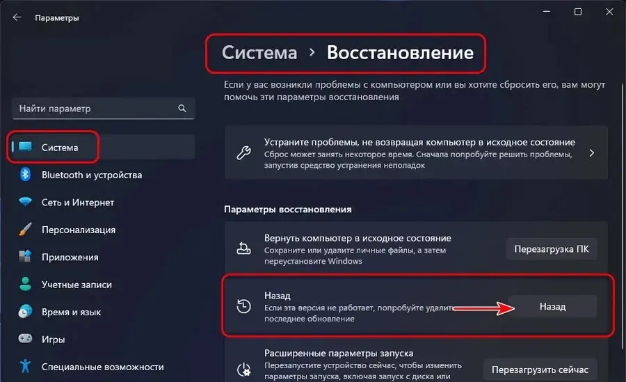 3. В блоке «Параметры восстановления» нажмите Назад.