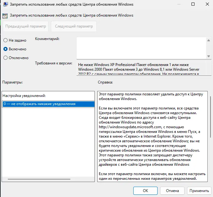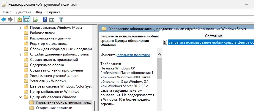 3. Включите параметр «Запретить использовать любые средства Центра обновления Windows». Тем самым вы отключите обновления в Windows, как только они понадобятся, выключите этот параметр.