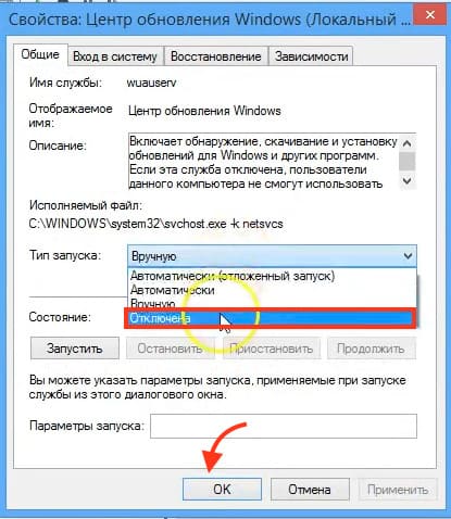 10) В разделе “Тип запуска”, выбираем “Отключить”, после этого жмем “Ок”.