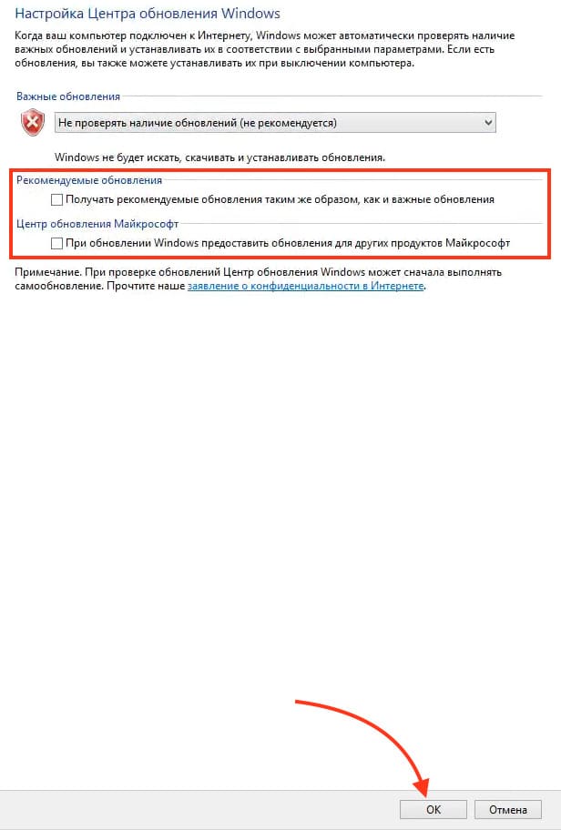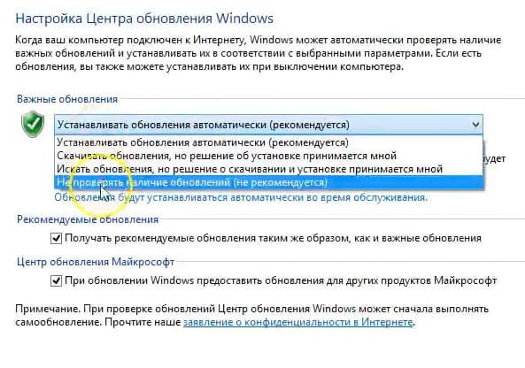 4) В пункте “Важные обновления”, выбираем “Не проверять наличие обновлений (не рекомендуется)”.