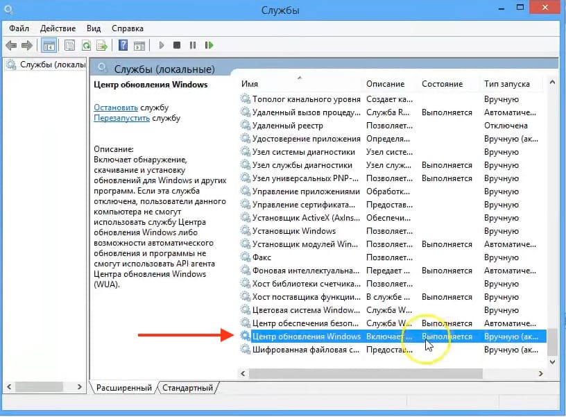8) Пролистываем в самый низ и находим “Центр обновления Windows”, кликаем два раза левой кнопкой мыши и открываем данную службу.