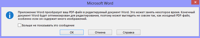 Нажмите ОК, и Word откроет ваш PDF-файл. Вы можете его редактировать, а затем сохранить (конвертировать) его в формат Word или оставить в формате PDF по вашему усмотрению. Для этого нажмите значок “дискеты” в левом верхнем углу, выберите место сохранения и конечный формат файла.