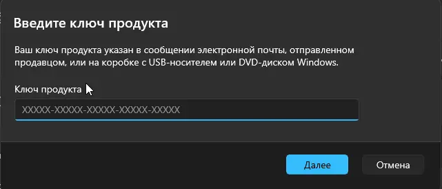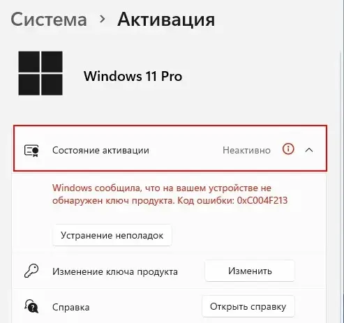 Неверный ключ продукта – ошибка 0xC004F213 или 0x803F7001, если ключ не подходит к текущей редакции.