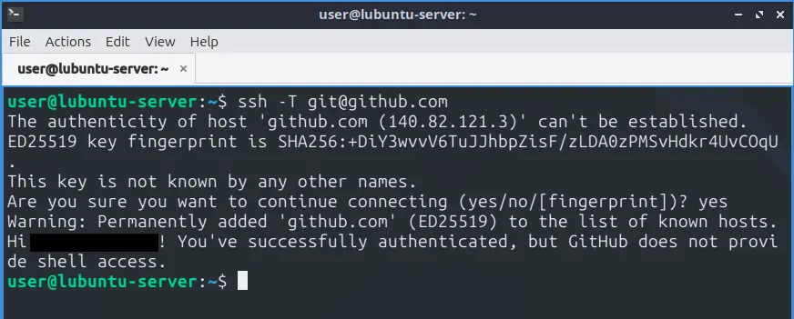 2. При первом подключении вас попросят подтвердить fingerprint (yes). Успешный ответ выглядит примерно так: «Hi username! You’ve successfully authenticated, but GitHub does not provide shell access.» — это означает, что всё настроено корректно.