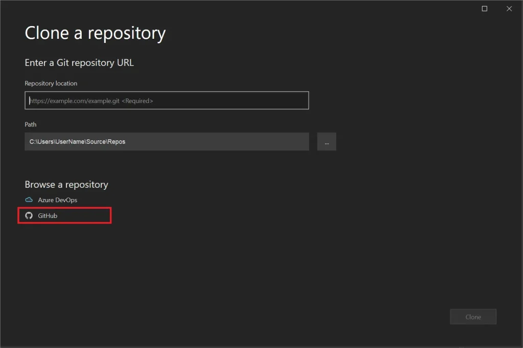 3. Укажите локальную папку и нажмите «Clone». Visual Studio использует системную установку Git — если ssh-агент запущен и ключ добавлен, аутентификация пройдёт автоматически. Если Visual Studio запрашивает вход через браузер, проверьте, не указывает ли remote на HTTPS (см. ниже).