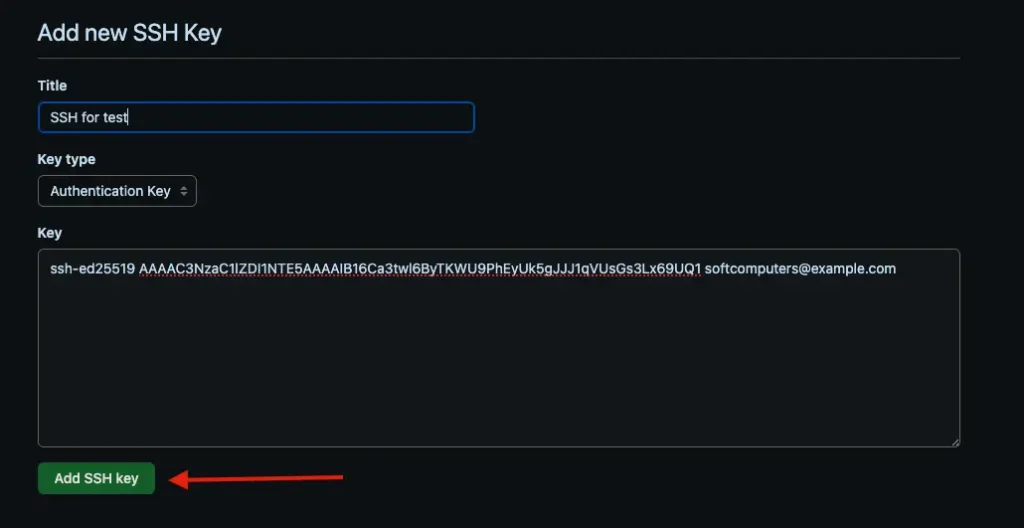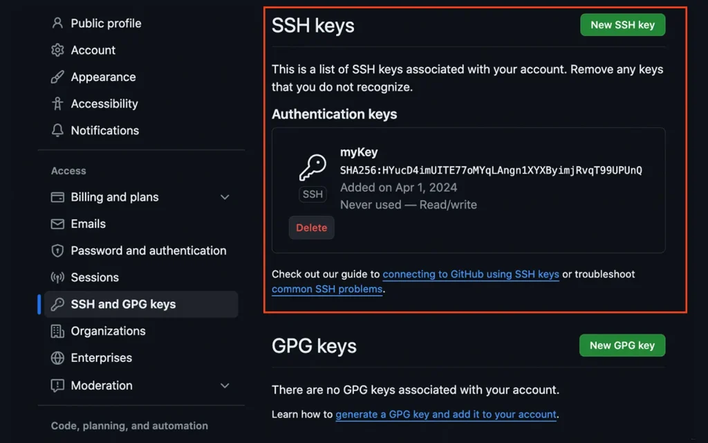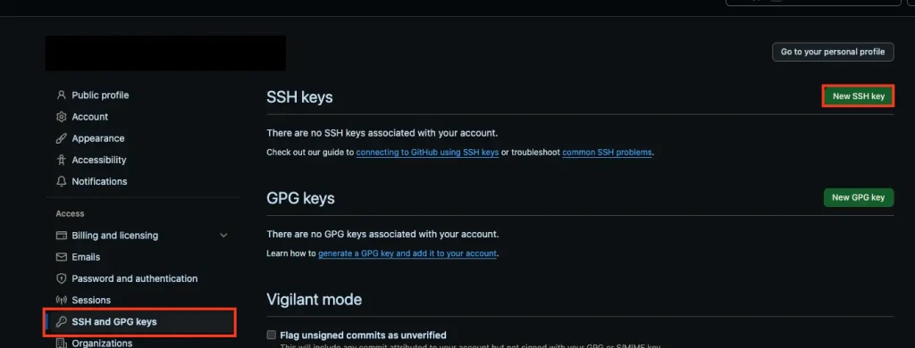 2. Войдите в GitHub → Settings → SSH and GPG keys → New SSH key. Дайте понятное имя (например, “laptop-work”) и вставьте ключ. Нажмите Add SSH key.