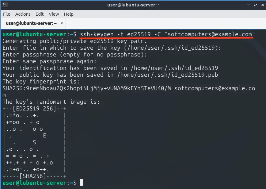 3. При появлении запроса укажите путь (по умолчанию ~/.ssh/id_ed25519) и введите надёжную парольную фразу (passphrase) — рекомендуется.
