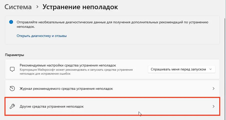1. Откройте «Параметры» → «Система» → «Устранение неполадок» → «Другие средства устранения неполадок».