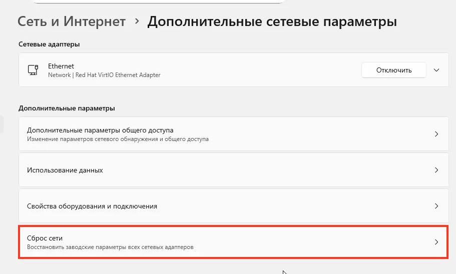 – Откройте «Параметры» → «Сеть и Интернет» → «Дополнительные параметры сети» → «Сброс сети».