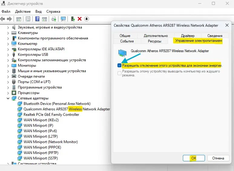 – Снимите галочку «Разрешить отключение устройства для экономии энергии» в свойствах адаптера (вкладка «Управление электропитанием»).