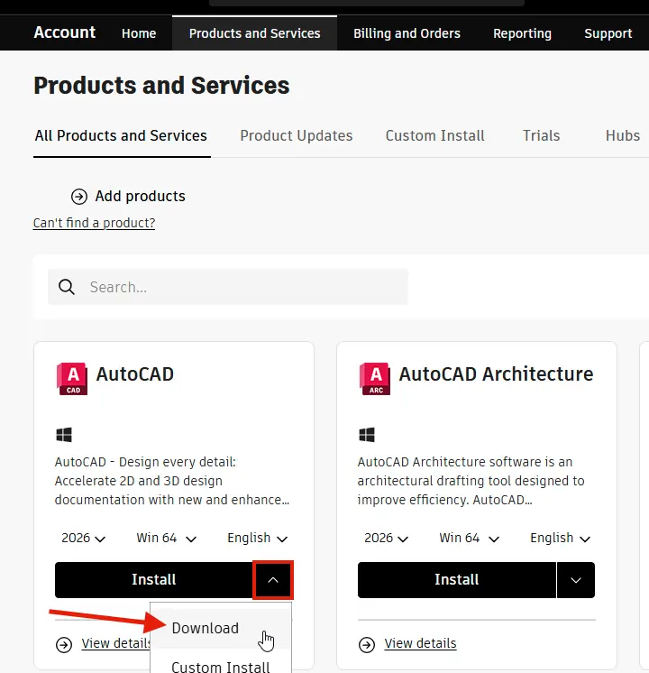 2. Вы будете перенаправлены в раздел All Products and Services вашего аккаунта Autodesk.