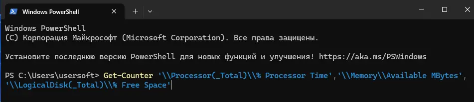 Get-Counter '\\Processor(_Total)\\% Processor Time','\\Memory\\Available MBytes','\\LogicalDisk(_Total)\\% Free Space'