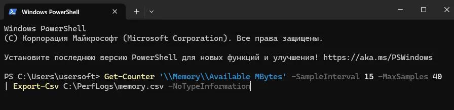 Get-Counter '\\Memory\\Available MBytes' -SampleInterval 15 -MaxSamples 40 | Export-Csv C:\PerfLogs\memory.csv -NoTypeInformation