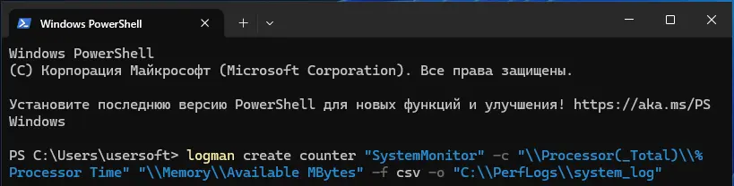 logman create counter "SystemMonitor" -c "\\Processor(_Total)\\% Processor Time" "\\Memory\\Available MBytes" -f csv -o "C:\\PerfLogs\\system_log"