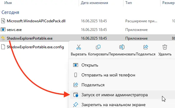 3. С версии 0.5 ShadowExplorer не требует административных прав, но для доступа к некоторым копиям может понадобиться запуск от имени администратора (правый клик -> «Run as administrator»).