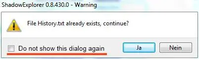 6. Если файл уже существует в целевой папке, ShadowExplorer покажет запрос на перезапись. Можно включить опцию «Do not show again» для автоматической обработки.