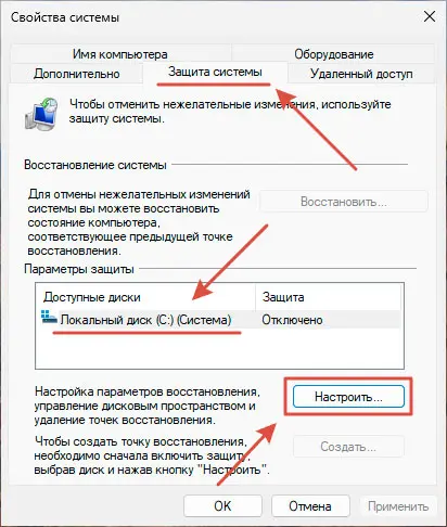– Выберите диск и нажмите «Настроить» -> «Включить защиту системы».