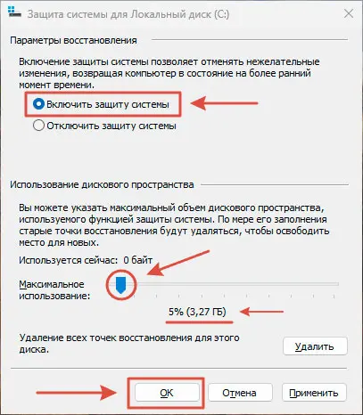 – По умолчанию System Protection включена только для системного диска (C:). Для других дисков активируйте защиту вручную: