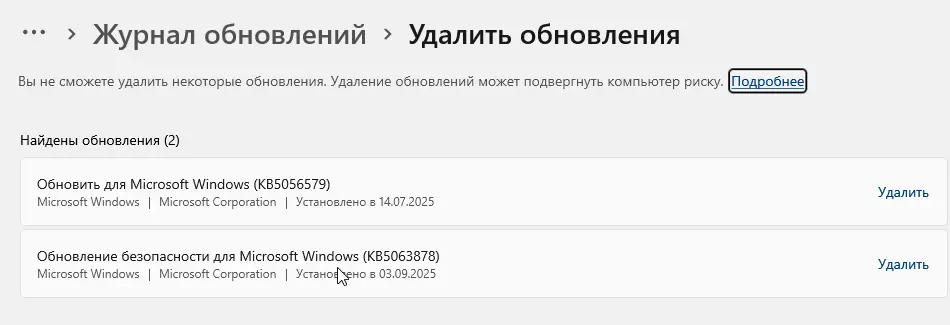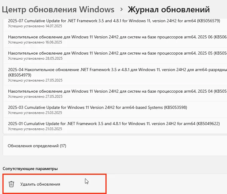 – «Параметры» → «Обновление и безопасность» → «Журнал обновлений» → «Удалить обновления».