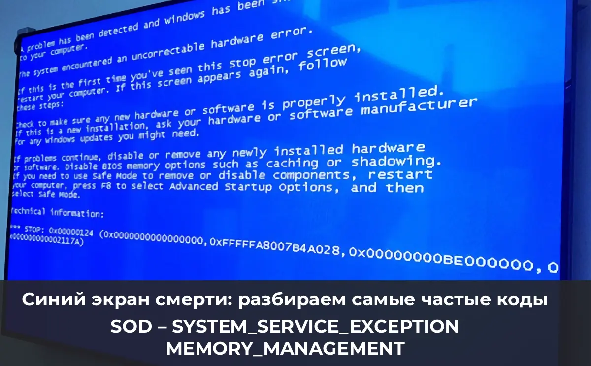 BSOD (Blue Screen of Death) – это механизм защиты Windows, который останавливает систему при критической ошибке, чтобы предотвратить повреждение данных. На экране отображается код ошибки (например, SYSTEM_SERVICE_EXCEPTION) и иногда имя проблемного драйвера или файла.