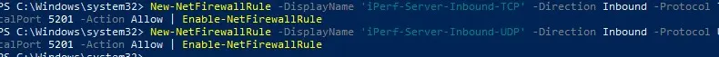 New-NetFirewallRule -DisplayName 'iPerf-Server-Inbound-UDP' -Direction Inbound -Protocol UDP -LocalPort 5201 -Action Allow | Enable-NetFirewallRule