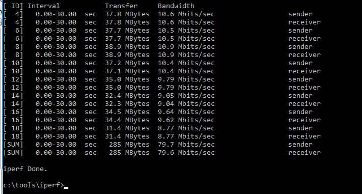 [SUM] 0.0-30.0 sec 285 MBytes 79.7 Mbits/sec receiver