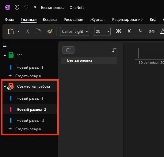 Блокнот в OneNote состоит из секций, которые можно распределять по темам или проектам. Для совместной работы это особенно полезно: