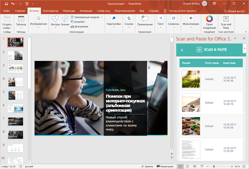 17) Scan&Paste – Это надстройка и приложение в одном лице. Позволит Вам быстро пересылать цифровые изображения из памяти на мобильных устройствах Android и iOS в приложения Word, PowerPoint и OneNote. На смартфоне нужно установить приложение Scan&Paste, скачать его можете в Google Play и App Store, соответственно.
