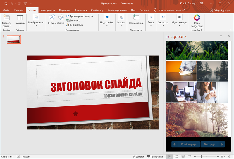 2) Imagebank – Прямой аналог вышеупомянутого расширения, с одним приятным ньюансом, пользоваться им можно бесплатно в течении 30 дней, после регистрации аккаунта на ресурсе фотобанка. Отлично подходит для того, чтобы быстро и без финансовых вложений красочно оформить свой документ или презентацию.