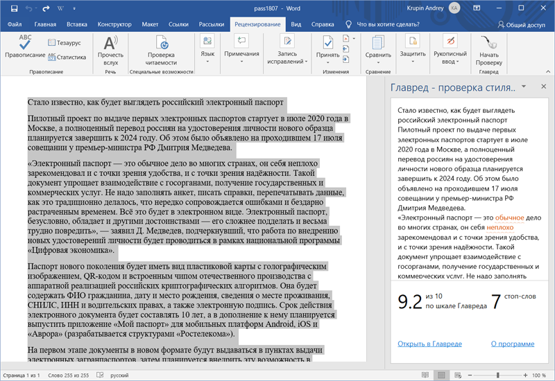 11) «Главред» – Умное расширение для улучшения читабельности текста в приложении Word. Дополнение поможет Вам найти в тексте стоп-слова: рекламные штампы, журналистикие штампы, слова-паразиты, плеоназмы, огульные обобщения, заимствования, которые были не правильно использованы, плохой синтаксис, не правильно поставленные слова, канцелярит и пр. требующие внимания словесные конструкции. Без этих слов текст становится понятным, коротким и информативным. Главред не проверяет орфографию и пунктуацию, т.к такая функция уже встроена в приложение Word.