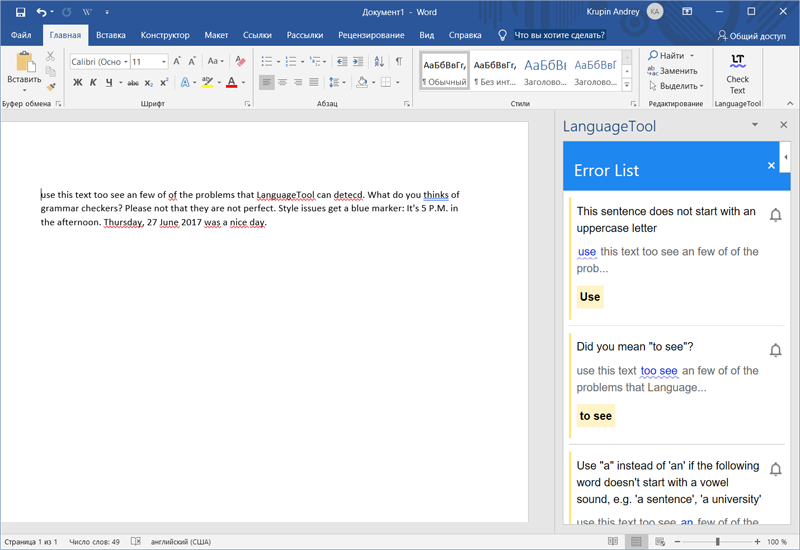 12) LanguageTool – Это дополнение является “дополнением” к уже существующей функции Word встроенной проверки правописания. Надстройка найдет Вам орфографические, пунктуационные ошибки, опечатки, и проблемы в стилевой грамотности набираемых текстов, что бы все слова были на своих местах. Дополнение поддерживает русский, английский, украинский, испанский, французский, немецкий, польский и многие другие языки. Отличный помощник для тех, кто изучает иностранные языки и хочет быть уверенным в правильности и грамотности написанного текста.
