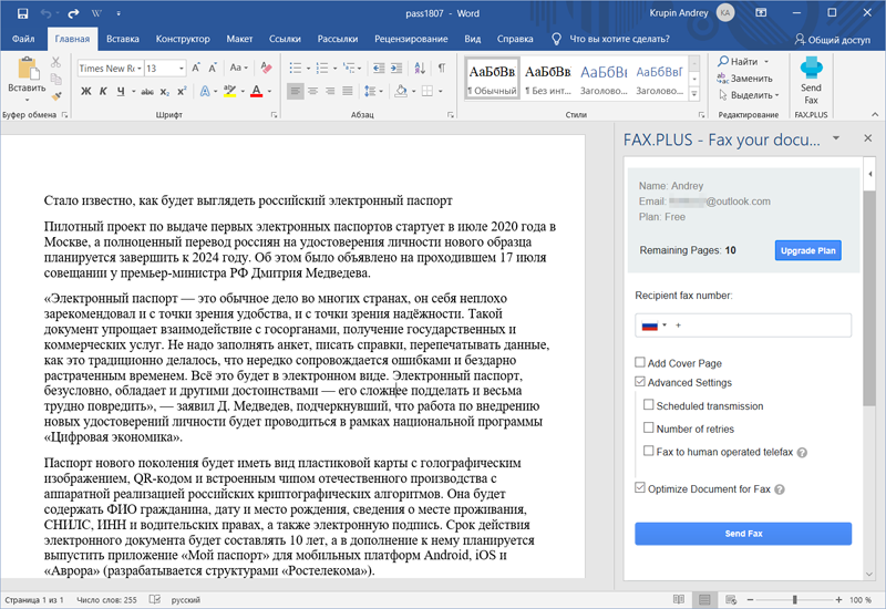 14) Fax.Plus – Дополнение для отправки Факса (факсимильных сообщений) прямо из приложения Word, поддерживается более 180 стран (в т.ч РФ) и отправка данных по расписанию. Передача факса осуществляется через интернет-сервис и благодаря этому подключать к компьютеру факс-модем, или телефонную линию не нужно.