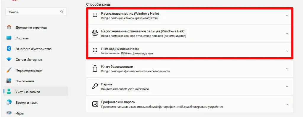 - Настройте Windows Hello (лицо, PIN или отпечаток)