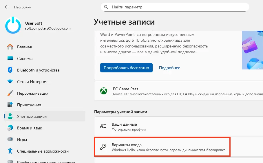 – Откройте Пуск → Параметры → Учетные записи → Варианты входа.