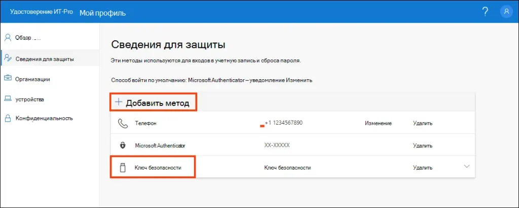 – В «Security info» нажмите «Добавить метод» → «Passkey».
