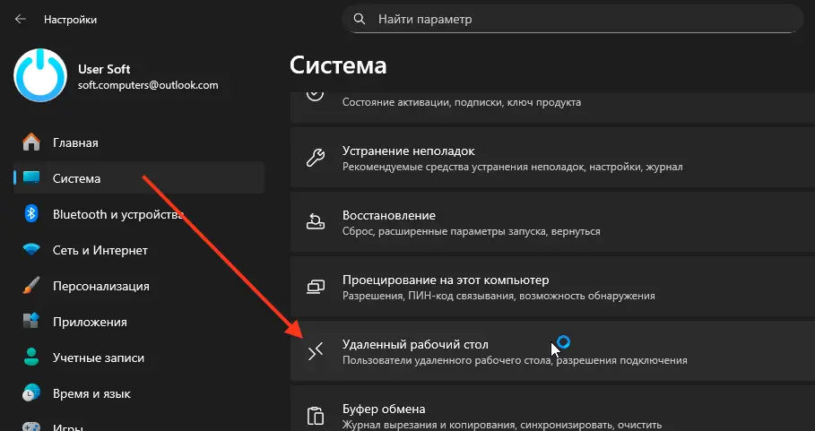 2. Зайдите в раздел Система → Удалённый рабочий стол.