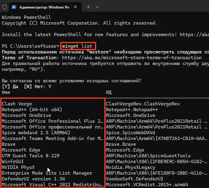 – Список установленных пакетов: winget list.