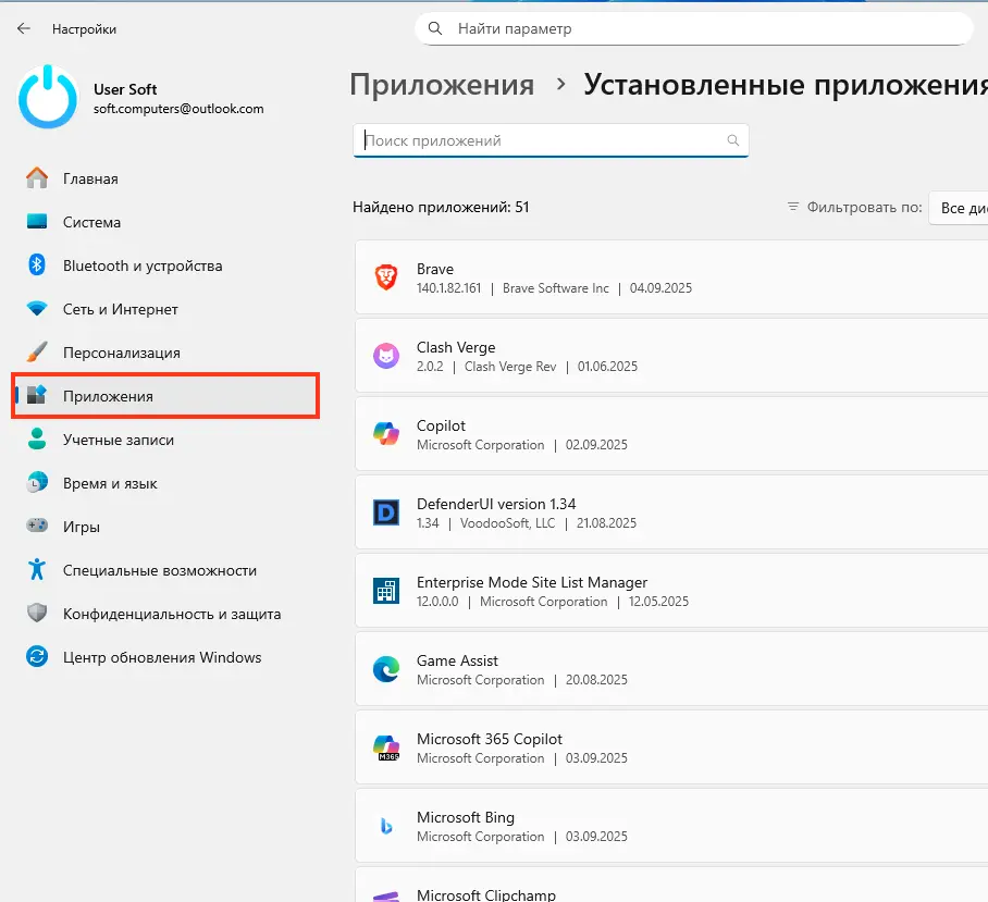 1. «Параметры» → «Приложения» → «Установленные приложения».