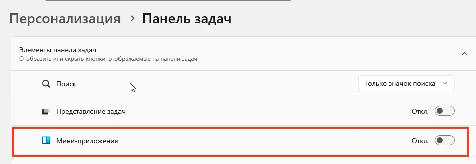 2. Отключите переключатель «Виджеты (Мини-приложения)».